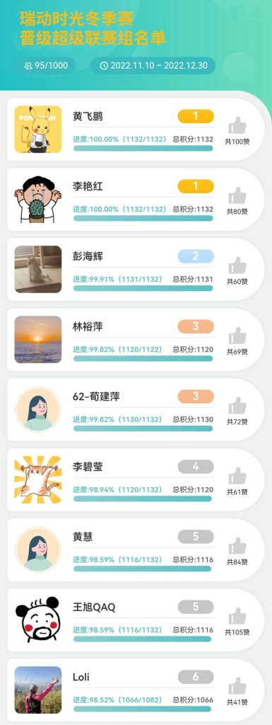 第七名:程梅;第八名:应蓓莉;第九名:廖勇;第十名:李奕龙。恭喜以上瑞动大神,可获得价值150元的瑞动礼品券。