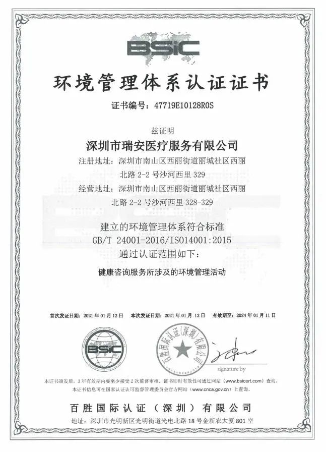 近日,瑞安医疗顺利通过ISO9001:2015质量管理体系认证证书、ISO14001:2015环境管理体系认证证书以及ISO45001职业健康安全管理体系认证。这代表着瑞安医疗在公司管理的标准化、规范化、科学化方面已走在行业前列,有助于进一步提升公司内部管理能力和综合服务实力,也进一步提升了瑞安医疗品牌价值和核心竞争力,对公司未来的产品创新研发、项目精益管理和市场业务拓展均将产生积极影响。