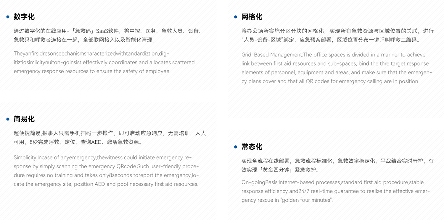 瑞安急救响应系统,实现急救体系标准化、数字化、简易化、常态化,并将零散的急救资源汇集归一实现有效协同调配,切实有效保障员工生命安全。